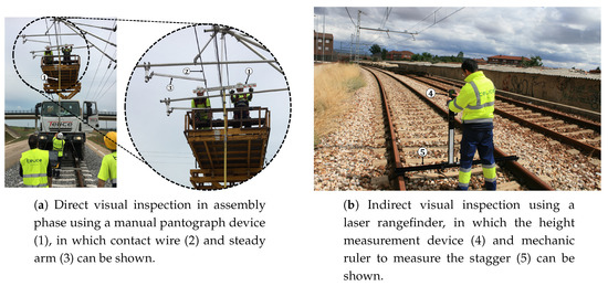 The maintenance task is normally performed by workers using manual inspection methods, both direct inspection (in assembly phase, as shown in Figure 1a) and indirect inspection (with laser rangefinders, as shown in Figure 1b). These are slow and low productive processes that involve a heavy workload prone to errors (visual readings, take notes on the field, manual data entry in the system, etc.), so its reliability is highly dependent on the operator knowledge and skills. However, the advancement of technology in matters related to capturing the environment and object recognition has increased the possibilities to automate the inspection of this type of environment with manual operated equipment.