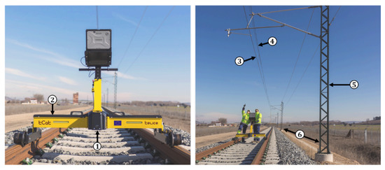 System used to perform the point clouds recording (Telice) in a typical railway environment where its key points; LiDAR (1), trolley (2), contact wire (3), messenger wire (4), mast (5) and mid-span (6) can be distinguished.