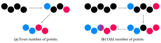 Cluster split process example for clusters that contain between four and six points. (a): split process with even number of points; (b): split process with odd number of points.