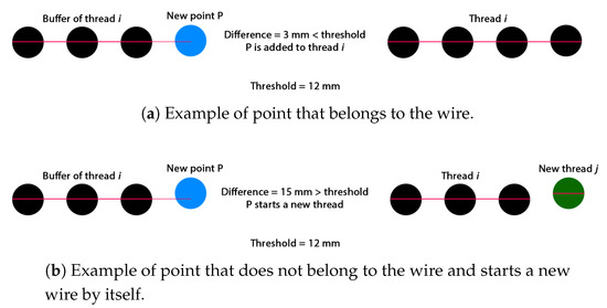 Check performed by the algorithm to label the current point analysed as belonging to that wire or not. (a): point that belongs to the wire; (b): point that does not belong to the wire.