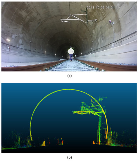 Real tunnel railway environment in which real environment data was collected. (a): picture from real environment; (b): point cloud recorded in the real environment.