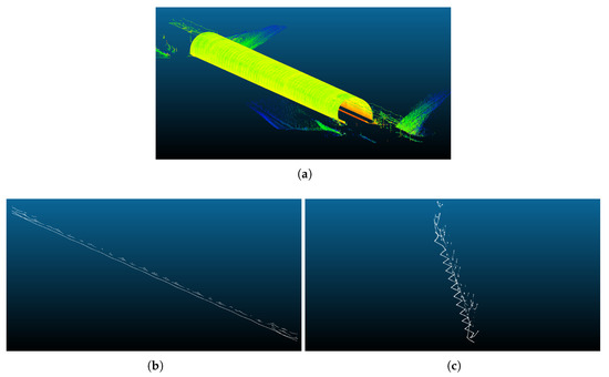 Figure 10a shows an amplified perspective centred in the overhead contact line of the test bench environment point cloud. In Figure 10b, only the points classified by the new method as contact wires are shown. Figure 10c shows an amplified perspective of the previous one.