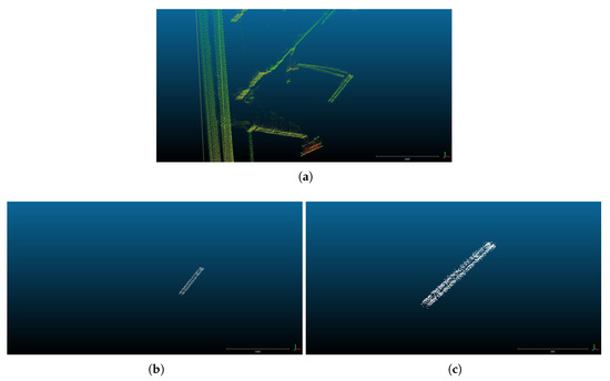 Point cloud recorded in a test bench environment and the points classified by the method as belonging to a wire in this point cloud. (a): an amplified perspective centred in the overhead contact line of the test bench environment point cloud; (b): points classified as contact wire by the new method; (c): a different perspective of the classified points.
