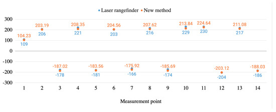 Figure 13 and Figure 14 graphically show the stagger measurement comparisons between the laser rangefinder and the proposed method carried out both in a real infrastructure and in a test bench.