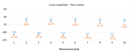 The measurements with the laser rangefinder were made at the points of interest of the track for operators, typically under the posts and in the mid-span. Said measurement points were noted and subsequent measurements were made at the same points using the proposed method.