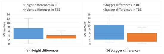 Results show a height average difference of 5.32 mm and 6.62 mm for the stagger in the real infrastructure environment, while these differences are reduced to 3.70 mm and 3.40 mm respectively in the test bench environment. Figure 15a graphically shows the distribution of the differences in height, and Figure 15b shows the differences in stagger. In both figures, the first box corresponds to the real infrastructure environment, and the second box represents the differences in the test bench environment.