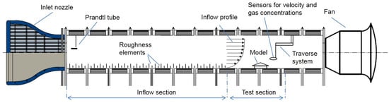The ABLWT was specially designed to investigate ventilation and dispersion processes in agricultural buildings [15,16,22]. It is 28.5 m long, consisting of an air inlet fitted of honey combs, an air outlet equipped with an axial fan and a 19.5 m long inflow section to develop the atmospheric boundary layer. The cross-sectional area of the test section had a width of 3 m and a height of 2.3 m.