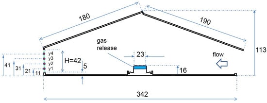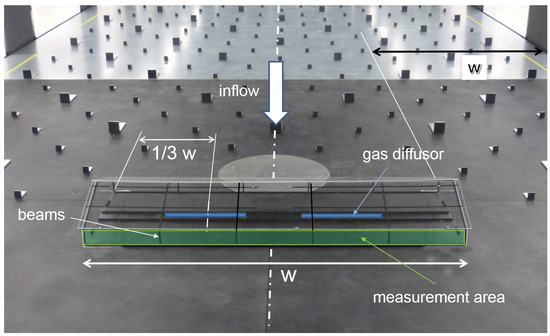 The model was placed at the symmetry line of the wind tunnel, oriented with sidewall openings perpendicular to the approaching flow and the measurement area at the downwind side. The blockage ratio of the scaled model to the cross-section of the wind tunnel was 1.6%, which is less than the recommended maximum value of 5% for wind tunnel tests in VDI-guideline 3783/12 [11], and thus the tunnel effect can be neglected. Figure 2 shows the wind tunnel with the scaled model placed inside.