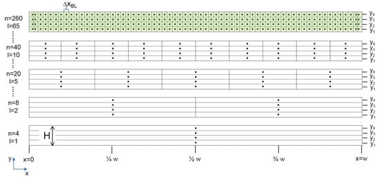 Lateral (x-direction) and vertical (y-direction) division of sampling positions. l is the number of vertical divisions and is increased incrementally from 1 to 65. n is the resulting total number of sampling points. The green marked area is the baseline configuration with the maximum amount of sampling points, with being the width of the area around each sampling point.