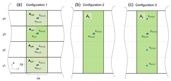 Construction of the area for each sampling point and the calculation of volume flow rates and emissions with the three configurations. The index l is for the lateral division of the measurement area in x-direction ([1...65]), the index k is the vertical position ([y1, y2, y3, y4]). Black dots and blue dots symbolize measurements of the velocity u and gas concentration c, respectively. Subfigures (a), (b), and (c) show configurations 1, 2, and 3, respectively. For configuration 1, the emission rate for a lateral division l is computed as . For configuration 2, the emission rate for a lateral distribution l and a vertical position k (in this example, k = y3) is computed as . For configuration 3, the emission rate for a lateral distribution l and a vertical position k (in this example, k = y3) is computed as .