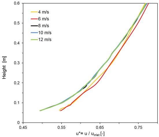 Vertical velocity profiles of the atmospheric boundary layer, with measured velocities u in position on the model. The undisturbed inlet velocity u at the inlet of the wind tunnel was gradually increased from 4 to 12 m s−1. The dimensionless velocity u* was normalized with u. For velocities u ≥ 8 m s−1, u* is constant, meaning that a fully turbulent, and hence Reynolds number-independent boundary layer, is achieved.