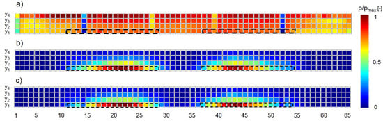 Measured concentrations, normal velocities and calculated emissions of the baseline configuration. Upper (a) shows the mean velocity u in normal direction for each sampling point; (b) shows the mean concentration c for each sampling point. (c) The computed emissions E = Q·c, where Q was calculated as the product of u and the area A that surrounded each sampling point. The results are normalized with the respective maximum values of u, c and E. “p” at the colorbar is a placeholder for the property shown—concentration, velocity or emissions. Numbers on the x-axis index the lateral sampling position. The black dotted lines sketch the positions of the gas diffusers inside the barn.