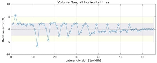 Evolution of the error for estimating the volume flow rate with a growing number of lateral sampling positions and only one constant height of the sampling points. The dotted line represents the value of the estimated volume flow rate with the maximum number of lateral divisions at the respective height.