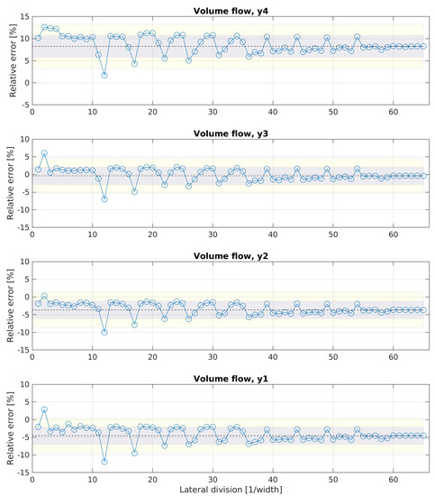 For all four heights, the error scatters around the converged mean value (CMV), which is estimated with the maximum number of lateral divisions, in a range of ± 5%. At each height, the positive outlier at l = 2 and the negative outlier at l = 12 can be observed, similarly to the characteristic in configuration 1. For all heights except y4, an error span around the CMV less than ± 2.5% was reached with l = 3. However, the values of the CMV can be interpreted as the induced bias of the configuration. The CMV showed a trend towards higher volume flow rates with a rising height. Positioning sensors only at height y1, y2, y3 or y4 would result in a bias of −5%, −4%, ±0% or +8%, respectively, when using the maximum lateral division of l = 65. For the lateral division of l = 3, the bias would be −3.4%, −2%, +0.5% or +12.3%, for y1, y2, y3 or y4, respectively.