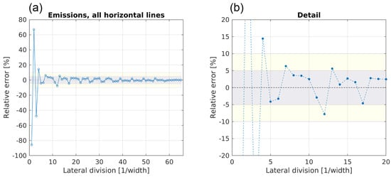 Evolution of the error for estimating the emissions with a growing number of lateral sampling positions, using configuration 1. Subfigure (a) shows the error for all 65 lateral divisions, subfigure (b) shows a detailed view for the first 20 lateral divisions. The dotted line represents the converged mean value (CMV) of the estimated volume flow rate with the maximum number of lateral divisions. The gray and yellow areas mark the error spans of ±5% and ±10% around the CMV, respectively.