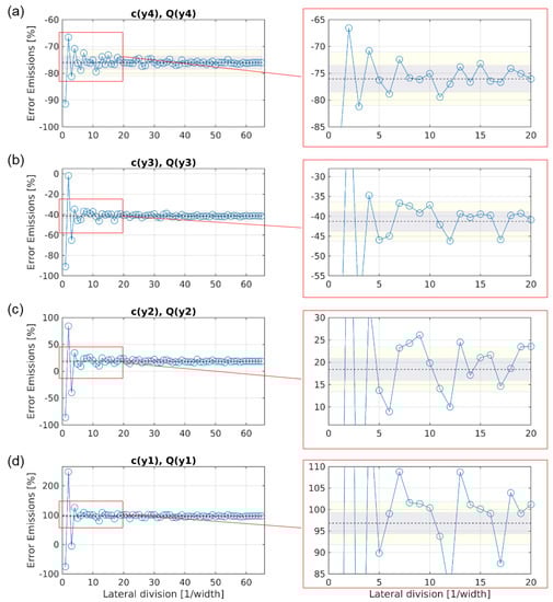 Evolution of the error for estimating the emissions with growing number of lateral sampling positions, using configuration 2. The subfigures (a), (b), (c), and (d) show the converging error, when velocities and gas concentrations were only measured at height y4, y3, y2, and y1, respectively. The dotted line represents the converged mean value (CMV) of the estimated emissions with the maximum number of lateral divisions. The gray and yellow areas mark the error spans of ±2.5% and ±5% around the CMV, respectively.