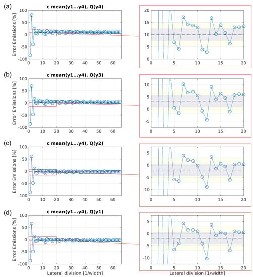 Evolution of the error for estimating the emissions with growing number of lateral sampling positions, using configuration 3. The subfigures (a), (b), (c), and (d) show the converging error, when velocities were only measured at height y4, y3, y2, and y1, respectively, while the concentration was measured as the mean value of the four vertical sampling points.The dotted line represents the converged mean value (CMV) of the estimated emissions with the maximum number of lateral divisions. The gray and yellow areas mark the error spans of ± 2.5% and ± 5% around the CMV, respectively.