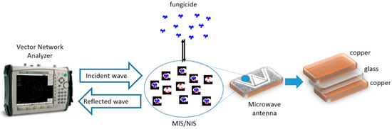 The microwave sensor coupled to MIS and NIS was described in a previous work [27] and is presented in Figure 1. The MIS/NIS deposition on the antenna surface was done by spin coating using a suspension of MIS or NIS in THF, after which the polymer layer was air-dried for 24 h. The spin coating parameters were as follows: speed = 1000 rpm, acceleration = 4000 rpm and time = 40 s. The polymer suspension was prepared as follows: 25 mg of MIS or NIS were transferred in 4 mL of THF containing 8 mg of PVC and were stirred until obtaining a homogenous solution.