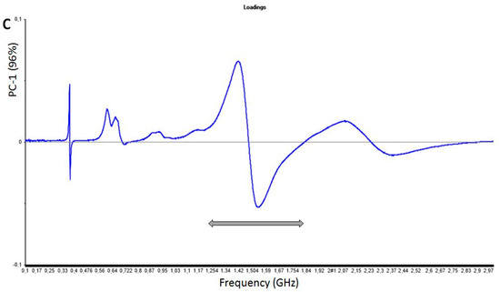 From the score plot (Figure 2B), it can be seen that all concentrations are well separated and distinguished. The plot also shows that the measurements are repeatable. Differences between C5 and higher concentrations come mainly from the 1.2–1.8 GHz area (Figure 2C). This frequency band corresponds to the strongest contributions of PC-1.