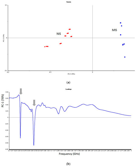 (a) PCA model of data presented in the two-dimensional space for the two principal components PC1 and PC2 explaining 91% of the total variance in the data. Example of procymidone detection in model wine medium (water/ethanol, 90/10, v/v) using the microwave sensor coupled to MIS or NIS. 29 samples from the MIS sensor and 30 samples from the NIS sensor. The procymidone concentration varied from 5 to 250 ng L−1. (b) Detection of procymidone in model wine medium (water/ethanol, 90/10, v/v) using the microwave sensor coupled to MIS or NIS. Loading plot for the first principal component (PC1).