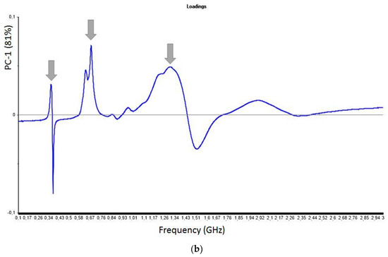 (a) PCA scores plot of datasets from the three fungicides at 5 ng L−1 analyzed with the microwave sensor coupled to MIS in a model wine medium (water/ethanol, 90/10, v/v). PC1 and PC2 account for 100% of the total variance in the data. (b) Loading plot for the first principal component (PC1) of three fungicides datasets at 5 ng L−1 in the model wine medium (water/ethanol, 90/10, v/v). Spectra were acquired using the microwave sensor coupled to MIS. Characteristic bands are highlighted by arrows.