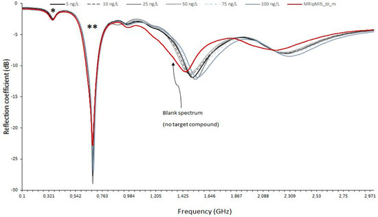 Detection of iprodione in a white wine sample using the microwave sensor coupled to MIS. Representative average microwave spectra. Added iprodione concentrations varied from 5 to 250 ng L−1. The two major bands (which contribute mostly to the model) are symbolized by * and **. The red spectrum corresponds to the white wine without any iprodione added.