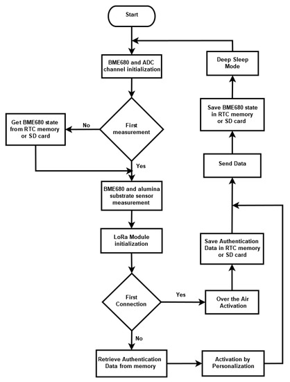 The program running on the LoRa nodes was developed using C language in Arduino IDE from Arduino, Somerville, MA, USA. Once the nodes are powered up, reset, or woken up from deep sleep mode, the first step is to initialise the BME680 sensor and the ADC channel for the resistance measurements of the lab-made sensor. If the microcontroller unit (MCU) is reset or just powered up, the second step is to perform a measurement with the sensors. On the other hand, if the MCU wakes up from deep sleep mode, the previous state (see Figure 4 and hardware description section) of the BME680 sensor should be obtained from the real-time clock (RTC) memory or the SD card, because it will be used for the proper calculation of the IAQ value. When the initialisation of the BME680 sensor is finished, the measurements are performed. Once a measurement is completed, the third step is to initialise the LoRa module with the proper spreading factor and the transmission power to enable the network communication. The fourth step is to establish the connection with the server to send the data. If the node is connected for the first time to the server (after being powered up or reset), it performs a join procedure with the network cloud server through an Over the Air Activation, where a device address is assigned dynamically and security keys (Network Session Key and Application Session Key) are negotiated. After establishing the connection with the server, the device address and the security keys are stored for using them in further connections. Differently, if the MCU awakens from a deep sleep mode, an Activation by Personalisation is performed, using the authentication data stored in memory. In the fifth step, after establishing the connection, sensor data are codified in order to minimise the number of bytes uploaded to the server and then sent to the cloud server. In the sixth step, the BME680 sensor sate is saved in memory. Finally, in the seventh step, the node goes to deep sleep mode until the next sensor measurements. Figure 4 shows the flow diagram of the software running on the nodes.