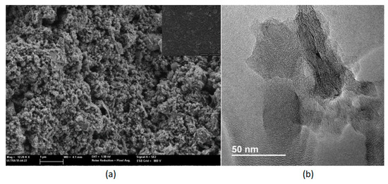 Images obtained by field-effect scanning electron microscope (FESEM) show a high porosity at the graphene surface (Figure 7a), which is helpful for gas sensing. In addition, the inset image (obtained at lower magnification) confirms that homogeneous layers can be obtained by using the spray coating technique. A high-resolution transmission electron microscopy (HR-TEM) analysis was also conducted (Figure 7b), showing graphene layers with diameters up to a hundred of nanometers.