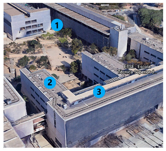 Locations were selected according to two different scenarios. In the first one, the nodes were placed near the gateway, which were separated one from each other by several offices inside the same building. This configuration allows avoiding interferences provoked by unfavourable weather conditions, while the transmission power used can remain low, thus saving power without affecting the network performance. In the second location, the nodes were placed at 115–130 m away from the gateway (in different buildings), with non-straight sight and structural obstacles between them. This ensures the analysis of the network performance when conditions are not the most favourable for the communication. The transmission power was set at 12 dB, 14 dB, and 20 dB to compare the RSSI and package loss values obtained when the TP increases. Figure 8 depicts the location of gateway and nodes at the University Campus for the second configuration.