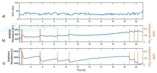 Sensor response to NO2. (a) IAQ value calculated by means of the Bosch Sensortec Environmental Cluster (BSEC) software library using the BME680 sensors exclusively, (b) BME680 metal oxide (MOX) sensor resistance, and (c) graphene sensor resistance. Right y-axes of graphs b and c show the NO2 concentration during the gas exposure.