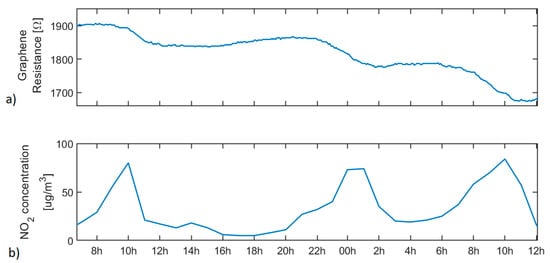 (a) Graphene sensor response during about 1 day of exposure to background level of NO2 present in ambient atmosphere, and (b) NO2 concentration registered by an automatic air quality station in Tarragona.