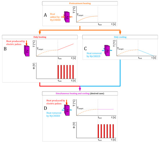 - Pretreatment (E = 0 V·m−1), HyCHEED has to heat the TV up to Ttarget. This implies that at t = 0 s the temperature of the TV is lower than TA, and in time the temperature must reach Ttarget. Therefore, TA = Ttarget. See Figure 1A.