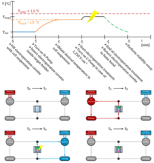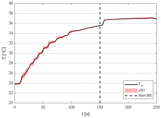 - During the treatment (E > 0 V·m−1), a stable temperature is maintained when the temperature rise caused purely by the electric pulses (Figure 1B) is combined with the temperature decrease caused solely by the cooling effect of term HV · (T − TA) (Figure 1C) to obtain a steady temperature as in Figure 1D. To satisfy this condition, TA must be adjusted at t = tinit such that TA < Ttarget. Using the combination of Equations (A1) and (A3), we can calculate TA by reducing Equation (A1) into