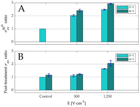 - In Figure 7B, the σav ratio for the control at 46 °C increased by 1.2-fold, while in the σav ratios for 500 V·cm−1 and 1250 V·cm−1 at 46 °C increased by 1.6 and 2.1-fold.