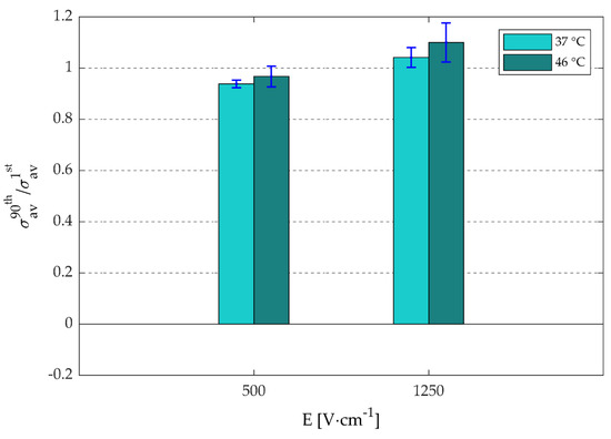 - In Figure 7A, the σav ratios for 500 V·cm−1 and 1250 V·cm−1 during the 90th pulse at 46 °C increased by 2.4 and 2.9-folds, while the σav ratios for the same pulse parameters at 37 °C increased by 2.0 and 2.5-folds.