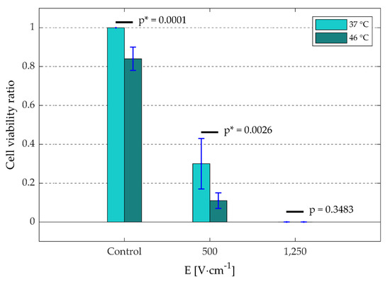 - In Figure 7A, the σav ratios for 1250 V·cm−1 at 37 °C and 46 °C increased by 2.5 and 2.9-folds, while the σav ratios for 500 V·cm−1 at 37 °C and 46 °C increased by 2.0 and 2.4-folds.