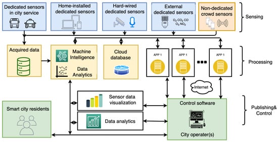 The latest advancements in wireless communication technology have propelled the widespread use of smart technologies, cloud computing, and the Internet of Things (IoT) [7]. IoT is the network of devices that enables connectivity between people, things or services [8,9,10,11]. Advances in manufacturing, sensor and cloud technologies results in a predicted up to 100 billion (with a minimum of 50 billion) devices with Internet connectivity by the end of 2020 [12]. The IoT-cloud environment enables data acquisition and transmission from all parts of a city while the data is processed in the cloud at a centralized server. The widespread use of smart technologies within communities and services has created the building blocks of a smart city [13]. Application areas within smart cities span from smart energy grid, smart transportation services, smart water distribution to smart homes [14,15,16,17,18]. A basic smart city ecosystem is displayed in Figure 1. Sensing as a service is also a vital role that contributes to a smart city [1,19,20]. The Sensing as a Service (SaaS) concept allows the acquired and aggregated data from embedded/built-in (i.e., non-dedicated) sensors in personal devices available to cloud users. This in turns alleviates companies from the requirement of their own sensing infrastructure. Mobile Crowdsensing is an emerging non-dedicated sensing method within smart cities sensing that uses the falls under the Sensing as a service business model. Where people are recruited into sensing campaigns and are compensated for the data collected by their personal devices [21,22].