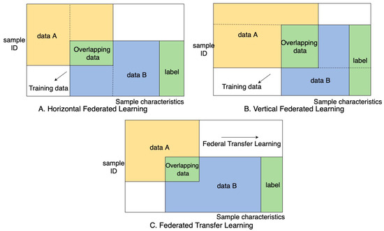 According to the distribution of data sources of the participating parties, Federated Learning can often be split into three types, they are specifically horizontal, vertical and transfer Federated Learning.