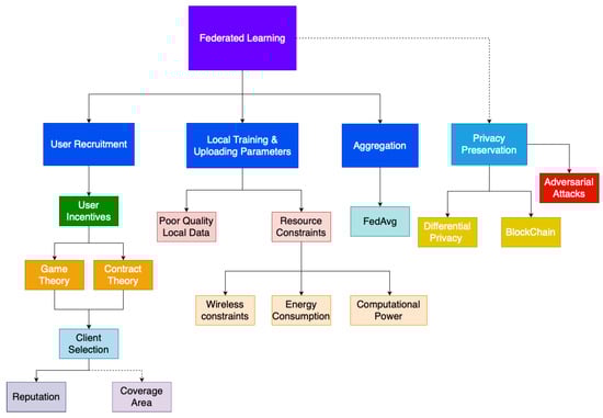 There are three major components of federated learning: data sources, Federated Learning systems, and users. The relationship between the three is shown in the Figure 2. Under the Federated Learning system, each data source performs data preprocessing, then jointly establishes and learns the model, and feeds back the output results to the client. The central server first saves the initial data and distributes it to the participating users [125]. Then the participants uses their own collected local data to train a local model. The parameters of the local model are then transmitted to the central server, while the participating user’s local data remain on their devices [41]. The central server then aggregates the parameters of the uploaded local models to build a global model. The updated global model would then be distributed back to the local users for additional training with local data. This procedure can be re-run until a desired outcome is seen, often when the global model shows a clear convergence. Each user is treated equally without bias in this process [126].