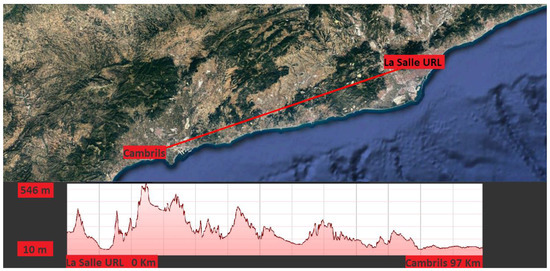 In La Salle University URL (Barcelona, Spain) there is an inverted V antenna acting as a transmitter NVIS node. The receptor is approximately 97 km away (Cambrils, Tarragona) where La Salle has a specific lab with the same antenna but making use of SIMO technique, so there are two of them and the phasing box. Figure 3 shows the link established within the line of sight between the transmitter and the receiver, as we can see at the profile elevation with an elevation peak of 546 m.