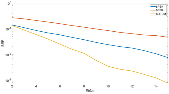 In Figure 6, we can see the results obtained for the 8FSK, 8QAM and the OFDM designed with an 8QAM modulation. In this case the OFDM is shown again to be the most robust. For an Eb/N0 of 10 dB we can obtain a BER of 4 × 10−3 by using an OFDM modulation, a BER of 2 × 10−3 by using an 8QAM and a BER of 8 × 10−1 by using an 8FSK. For a lower Eb/N0 as 5 dB, we can see that we obtain a BER of 4 × 10−2 for the OFDM, a BER of 7 × 10−2 for the 8QAM and a BER of 2 × 10−1 for the 8FSK.