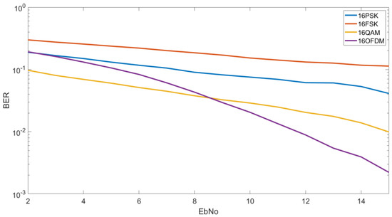 In Figure 7, we analyze the results of 16FSK, 16QAM, 16PSK and the OFDM designed with a 16QAM modulation. In this case, OFDM is only the most robust modulation for high Eb/N0 and 16QAM the most robust modulation for low Eb/N0. As we can see for an Eb/N0 of 10 dB we can obtain a BER of 2 × 10−2 by using an OFDM modulation, a BER of 3 × 10−3 by using a 16QAM, a BER of 7 × 10−2 by using an 8PSK and a BER of 2 × 10−1 by using a 16FSK. For lower Eb/N0 as 5 dB, we can see that we obtain a BER of 6 × 10−2 for the 16QAM, a BER of 10−1 by using an OFDM, a BER of 10−1 for the 16PSK and a BER of 2 × 10−1 for the 16FSK.