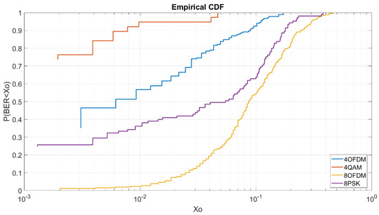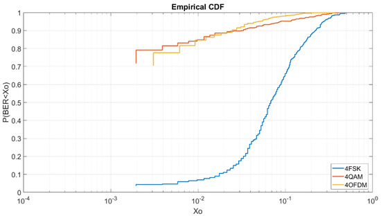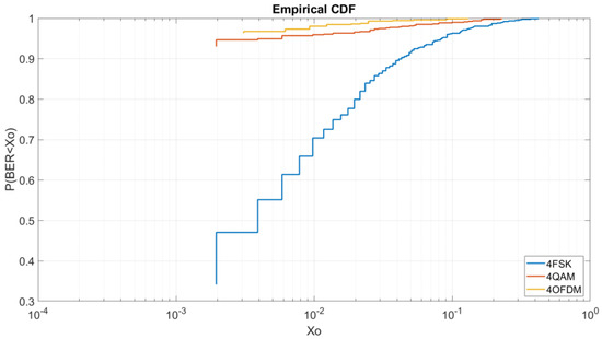 Once the order modulations with a low Eb/N0 of 5 dB are analyzed, we will analyze the same modulations with a Eb/N0 of 8 dB. At Figure 11, we can see that the OFDM has better results than the 4QAM due to the increase of Eb/N0. To obtain a BER lower than 6 × 10−3 we have a probability of 97% for the OFDM, a probability of 95% for the 4QAM and a probability of 61% for the 4FSK. For this Eb/N0, we can see in Figure 11 that the OFDM always has better results than the 4QAM unlike the CDF of Figure 8.