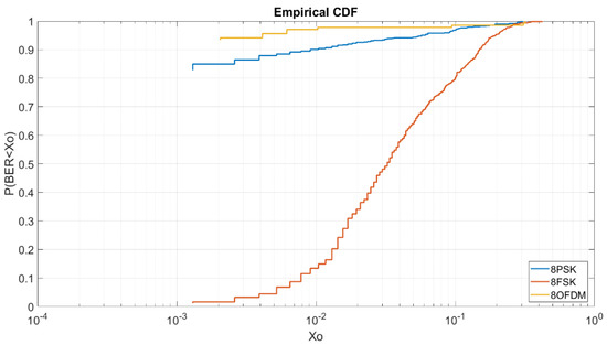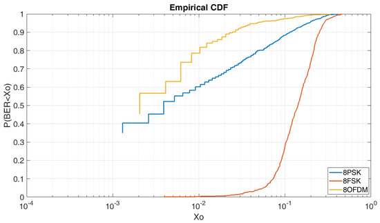 In Figure 9, we can see the CDF for an Eb/N0 of 5 dB and order of modulation 8. As we can see, in this case, the OFDM obtains the best results in comparison of the 8PSK and the 8FSK. To obtain a BER lower than 2 × 10−3 we have a probability of 56% for the OFDM and a probability of 45% for the 8PSK. For the 8FSK, we have a probability of a 1% to obtain a BER lower than 4 × 10−3.