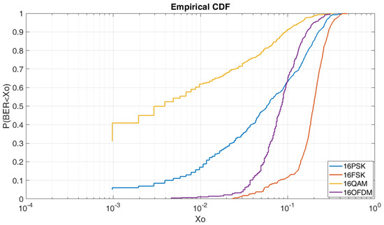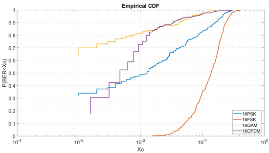 In Figure 10, we can see the CDF for a Eb/N0 of 5 dB and order of modulation of 16. In this case, contrary to Figure 9, 16QAM obtains the best results in comparison of the 16PSK, the 16FSK and the OFDM. As we can see, to obtain a BER lower than 5 × 10−3 we have a probability of 54% for the 16QAM, a probability of 10% for the 16PSK, and a probability of a 4% for the OFDM. At this figure, the OFDM is highly affected due to the increase of modulation order. Finally, in this case, the 16FSK has a probability of 10% to obtain a BER lower than 10−1.