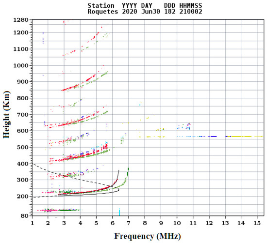 Taking into account the results obtained in Section 4.1 BER vs. Eb/N0 and Section 4.2 BER CDF, we can analyze that the most robust modulations for order modulations 4 and 8 are the OFDM with a 4QAM and the OFDM with an 8PSK modulation. Despite the results, during a transmission with an average power, the analysis the Eb/N0 received can have high variations. At Figure 14 we can analyze the CDF BER received signal for low power transmissions of 4QAM, 8PSK, OFDM with 4QAM and OFDM with 8PSK respectively with average power transmissions of 4.7 W, 5.1 W, 3.4 W and 3.7 W. Despite the similar average powers, the efficiency of the OFDM is 63% lower than the narrow-band modulations because of the low value of the IBO. As we can see in Figure 14, the graphic is based on the received signals between 20 UTC and 00 UTC, a range in which the channel presents high delay spreads of 2 ms affecting the robustness of narrowband modulations. To analyze the time range with a greater presence of multipath, we analyzed the ionograms of the Observatori de l’Ebre [22], and in Figure 15 we can distinguish the presence of the different ionosphere layers responsible for signal rebounds. The red line shows the possible reflection of the ordinary wave and the green line shows it for the extraordinary one. In Figure 15 we can see also the multipath produced with more than 8 paths.