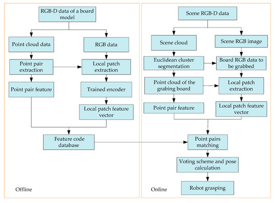 The local image patches of the wooden plank images both from the self-developed scanning equipment and the disorderly stacking plank scene here are taken as a data set. Using the strong fitting ability of a deep convolutional autoencoder, the convolutional autoencoder is trained to obtain stable local texture feature descriptors. The overall algorithm flow realized by robot grasping is shown in Figure 1. In the offline stage, a pair of feature points are randomly selected on the wooden plank image and local image patches are intercepted. These two image patches are sequentially input to the trained feature descriptor to obtain the local feature vector and combine the geometric feature information of the point pair to build the feature code database of the plank model. In the online stage, the disorderly stacking plank scene is segmented and the plank area to be grasped is extracted, and the geometric feature information of the point pair is also extracted and the feature description code of the local image patch is found, similar to the offline stage. Then, point pair matching is performed with the established plank feature database. Finally, the robot is used to realize the positioning and grasping operation after all the point pairs complete pose voting and pose clustering.