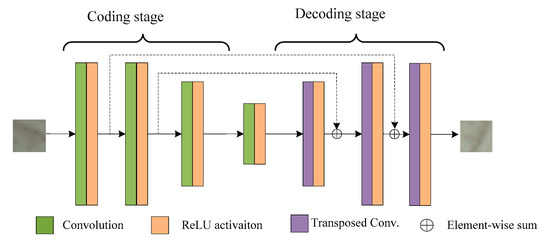 Traditional autoencoders [32,33,34] are generally fully connected, which will generate a large number of redundant parameters. The extracted features are global, local features are ignored, and local features are more important for wood texture recognition. Convolutional neural networks have the characteristics of local connection and weight sharing [35,36,37,38,39,40], which can accelerate the training of the network and facilitate the extraction of local features. The deep convolutional autoencoder designed in this paper is shown in Figure 2. The robot drives the camera to collect small image patches at different angles around the same feature point in the scene of disorderly stacked wood planks as the input and expected value of output to train the convolutional autoencoder. Its network is mainly composed of two stages, namely, encoding and decoding. The encoding stage has four layers. Each layer implements feature extraction on input data convolution and ReLU activation function operations. There are also four layers in the decoding stage. Each layer implements feature data reconstruction through operations such as transposed convolution and ReLU activation function operations. This network model combines the advantages of traditional autoencoders and convolutional neural networks, in which residual learning connections are added to improve the performance of the network.