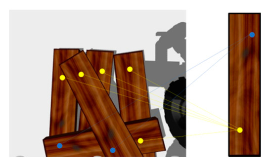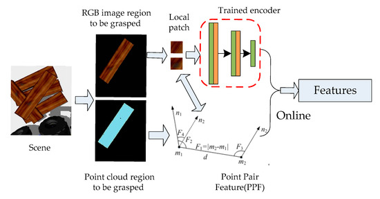 Since the stacked wooden planks have obvious hierarchical characteristics, the robot’s grasping process is generally carried out in order from top to bottom, and the wooden plank grasped each time should be the top layer in the scene at that time. First, the Euclidean distance cluster method [41] was used to segment the scene under robot vision, then calculating the average depth of different clusters and selecting the smallest average depth value as the area to be grasped. As shown in Figure 8, there is no need to match all the wood planks in the scene later, which saves on the computing time. Next, we randomly extracted a part of the scene pointpair feature information and the point pair corresponding local image patches from the area to be grasped, and input the local image patches into the trained encoder to generate local image patch feature vectors. These were combined with the pointpair geometric feature information to form a feature description code.