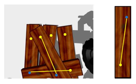 From Equation (8), it can be seen that the complex pose solving problem is transformed into the problem of matching model point pairs and corresponding angles , so it can be solved by ergodic voting. We created a two-dimensional accumulator, where the number of rows is the number of scene model points , and the number of columns is the value after the angle is discretized. When the point pair extracted in the scene matches the point pair of the model correctly, one of the two-dimensional accumulators corresponds to it, that is, the position is voted.When all the point pairs composed of the scene point and other points in the scene have been processed, the position where the peak vote is obtained in the two-dimensional accumulator is the desired position. An angle can estimate the posture of the plank, and the position of the model point can estimate the position of the plank.
